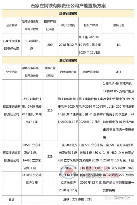 2018年10月30日,河北省工信廳發布了《河鋼集團石家莊鋼鐵有限責任公司建設項目產能置換方案公示》,提出河鋼石鋼將于2018年12月在石家莊市井陘礦區開工建設新項目。在搬遷設計上,河鋼石鋼將在井陘礦區新建兩座130噸電爐,換算產能為200萬噸。