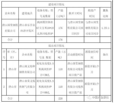 2019年8月,河北省工信廳發布《唐山國堂鋼鐵有限公司重組暨焦化搬遷改造項目焦炭產能置換方案公告》。